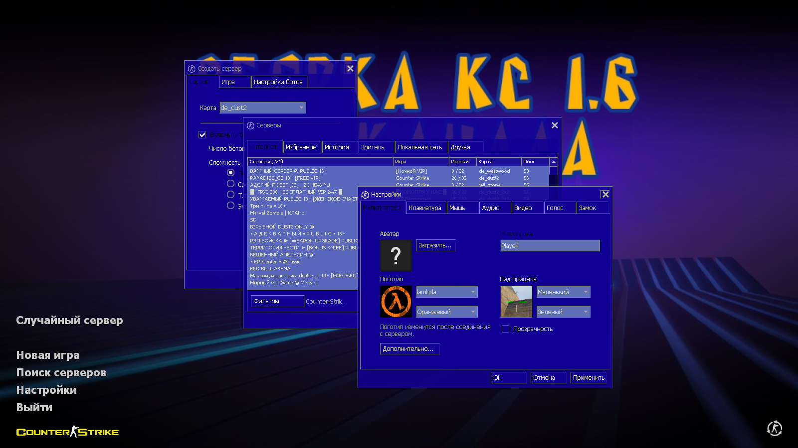 CS 1.6 от Wolf Channel — это сборка Counter-Strike от бывшего ютубера с 8 новинками, среди которых: 15 скинов оружия от блогера с разными руками, красные модели террористов и синие модели спецназа, синяя тема меню, никнейм автора сборки и фиолетовая абстракция в качестве фона главного меню и оптимизированный конфиг. Помимо этого, обновление получили: звуки, музыка в меню и значок запуска.Также сборка обладает всеми возможностями оригинальной игры: работает на всех версиях Windows, можно играть как онлайн (250+ серверов), так и с ботами на любых картах, ставить русский никнейм и писать в чате по-русски, устанавливать любые моды.
